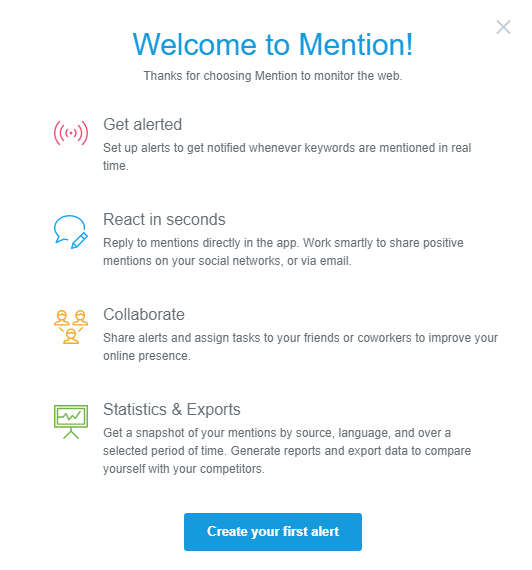 Nobody wants to spend a lot of time studying the app’s functions, and that is why you should send in-app greeting messages to users. With these notifications, you can answer most of the questions that would otherwise be sent to your team. For example, Mention uses welcome messages to provide new users with information about the basic functions of their product. The CTA button at the bottom of the alert directs the user to the next step.