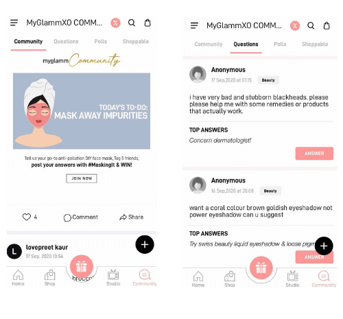 With the help of GetSocial Activity Feeds, MyGlamm has integrated a Community feature that gives users an opportunity to participate in contests initiated by MyGlamm creators by sharing their favorite beauty recipes. Users can like, comment, and share each other’s posts and even create polls and ask questions when they have concerns or need advice.